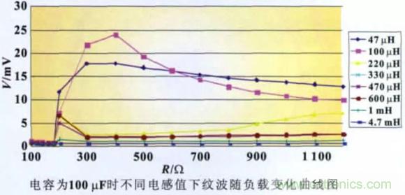 電容固定(貼片鉭電解220 μF/16 V),改變圖1 中CLC 濾波電路的電感值大小,測量不同負載時紋波的有效值,得到如圖8 所示的曲線圖,其中電感使用的是弓形電感。