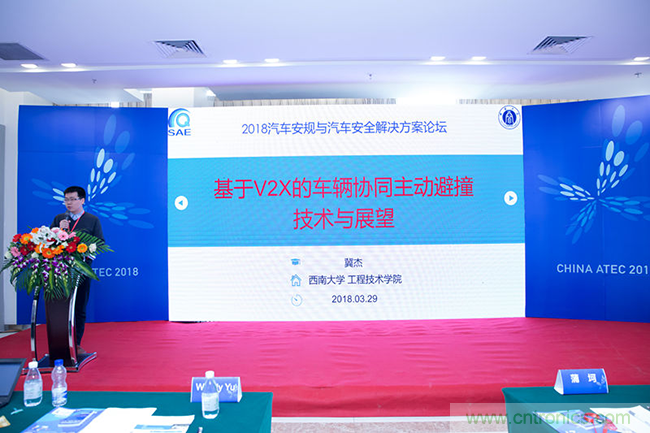 西南大學汽車電子專家冀傑博士在論壇上做了車規與基於V2X的車輛協同主動避撞技術展望的大會報告。