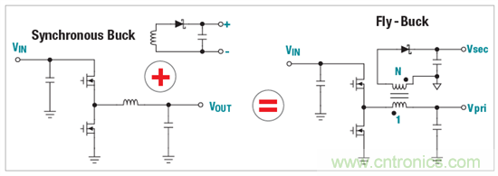 圖1:Fly-Buck轉換器創建方式是在一個同步降壓轉換器內添加耦合繞組。
