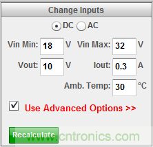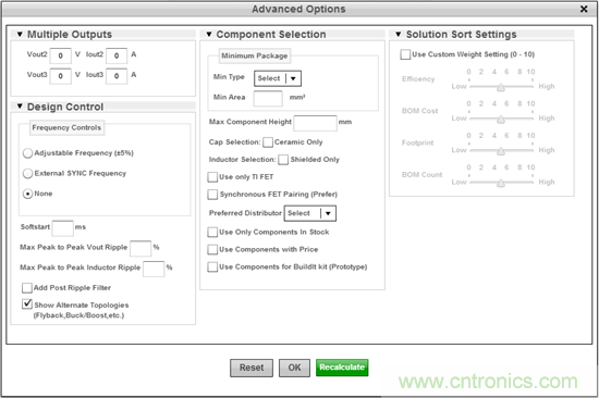 單擊“Use Advanced Options”(使用高級選項)來打開Advanced Options菜單(圖3)。在Design Control(設計控製)項下,確保“Show Alternate Topologies”(顯示替代拓撲)複選框被選中,這樣將列出所有可能的Fly-Buck解決方案。在你確認複選框的選擇後,單擊“Recalculate”(重新計算)按鈕來繼續。