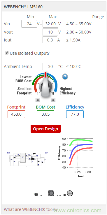 在第二個方法中,你需要確定打算在Fly-Buck設計中使用的器件。比如說,你打算在Fly-Buck設計中使用LM5160。在LM5160產品文件夾中,你將會找到一個專門為這個器件創建的WEBENCH設計工具控製麵板(圖4)。