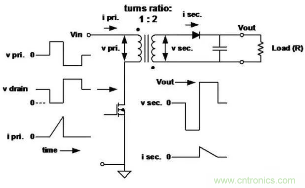 ■此處初級電感很低,用於確定峰值電流和存儲的能量。當初級開關斷開時,能量傳送到次級。