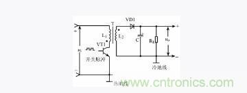反偏截止,開關管電流下降為0,而集電極電壓上升為高電位。根據同名端的定義,脈衝變壓器T次級線圈L2上就會感應得到上正下負的脈衝電壓,該電壓使二極管VD1正偏導通。這樣,開關變壓器 T 次級繞組感應輸出的電壓一方麵為負載RL提供電流,另一方麵又對電容器C進行充電。