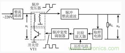 脈衝整流濾波後的 uo電壓一方麵為負載 RL供gong電dian,另ling一yi方fang麵mian加jia到dao取qu樣yang電dian路lu上shang。當dang輸shu出chu電dian壓ya變bian化hua時shi,取qu樣yang電dian路lu取qu樣yang後hou的de電dian壓ya加jia到dao比bi較jiao放fang大da電dian路lu,與yu基ji準zhun電dian壓ya比bi較jiao後hou的de電dian壓ya信xin號hao再zai送song至zhi脈mai衝chong寬kuan度du調tiao製zhi器qi,調tiao製zhi後hou的de脈mai衝chong信xin號hao控kong製zhiVT1的導通與截止的占空比。