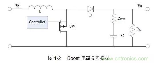 Buck型和Boost型開關電源具有不同的拓撲結構,本文將使用如圖1-1、1-2所示的電路參考模型[1]:
