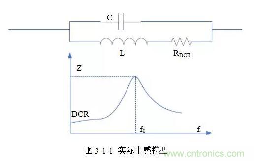 理想模式的電感,其阻抗與頻率呈線性關係,會隨頻率升高而增大。實際電感模型如圖3-1-1所示,由電感L串聯R(DCR)和寄生電容C並聯而成,存在自激頻率f(o)。頻率小於f(o)時呈感性,大於f(o)時呈容性,在f(o)處阻抗最大。