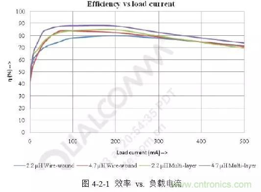 但是,疊層電感的SATI也較小,因此其在重載時會有較大的紋波電流,導致輸出的紋波電壓也相應增大。圖4-2-1所示是Taiyo Yuden的兩種繞線電感與三星的兩種疊層電感負載電流和效率的關係曲線。