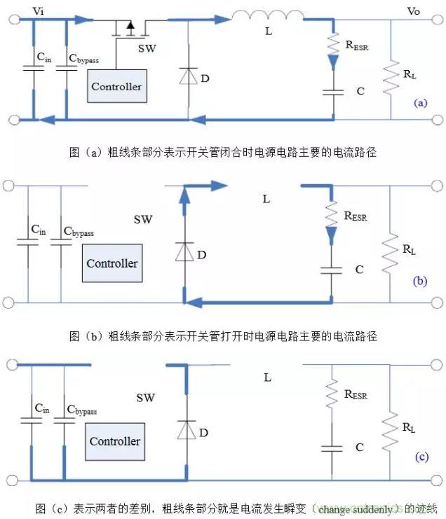 以Buck電路為例,不管開關管是由閉合-打開還是打開-閉合,電流發生瞬變的部分都如圖(c)所示,它們是會產生非常豐富的諧波分量的上升沿或下降沿。通俗的講,這些會產生瞬變的電流跡線(trace)就是所謂的“交流”(AC current),其餘部分是“直流”(DC current)。當然這裏交直流的區別不是傳統教科書上的定義,而是指開關管的PWM頻率隻是“交流”FFT變換裏的一個分量,而在“直流”裏這樣的諧波分量很低,可忽略不記。所以儲能電感屬於“直流”也就不奇怪,畢竟電感具有阻止電流發生瞬變的特性。因此,在開關電源布局時,“交流”跡線是最重要和最需要仔細考慮的地方。這也是需要牢記的唯一基本定律(only basic rule),並適用於其它法則和拓撲。下圖表示了Boost電路電流瞬變跡線,注意它和Buck電路的區別。