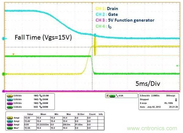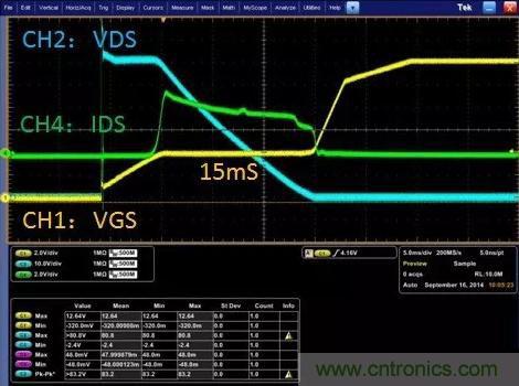 在電池保持板PCM過流關斷的過程中,從波形可以看到:功率MOSFET同樣也有較長的一段時間工作於線性區。