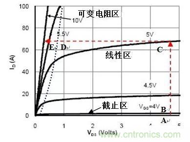 整個過程中,A-B為截止區,D-E為可變電阻區,B-C-D為線性工作區。線性區產生開關損耗,對於一個開關周期,此時間段越長,開關損耗越大。