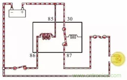 車輛繼電器多為四腳,工作原理如下圖所示。當開關閉合後電流從蓄電池正極經過繼電器的85#線圈端子從86#流回蓄電池的負極,線圈兩端就會產生磁場。線圈產生磁場後,就會吸引觸點的87#和30#端子,使繼電器的觸點閉合,從而實現小電流控製大電流。