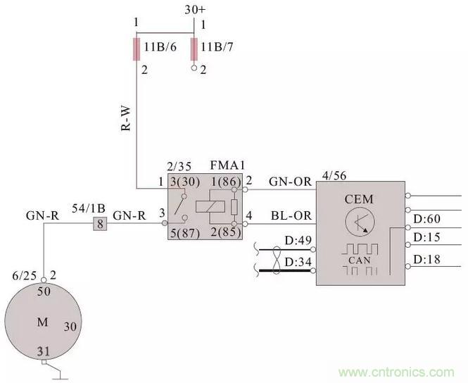 如下圖所示的啟動係統電路中,CEM接收到點火開關模塊的啟動信號後,輸出12V電壓信號給啟動繼電器的2號端子,並控製啟動繼電器的4號端子搭鐵,啟動繼電器電磁線圈通電,繼電器吸合。蓄電池供電通過保險絲進入啟動繼電器的1號端子,在經過其3號端子流出供給起動機,起動機得到供電運轉帶動發動機啟動。
