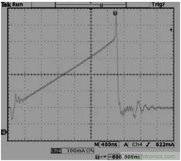 32.反激拓補結構,變壓器B值需小於3500高斯,如果變壓器飽和一切動作將會失控,如下,上圖為正常,下圖為飽和。