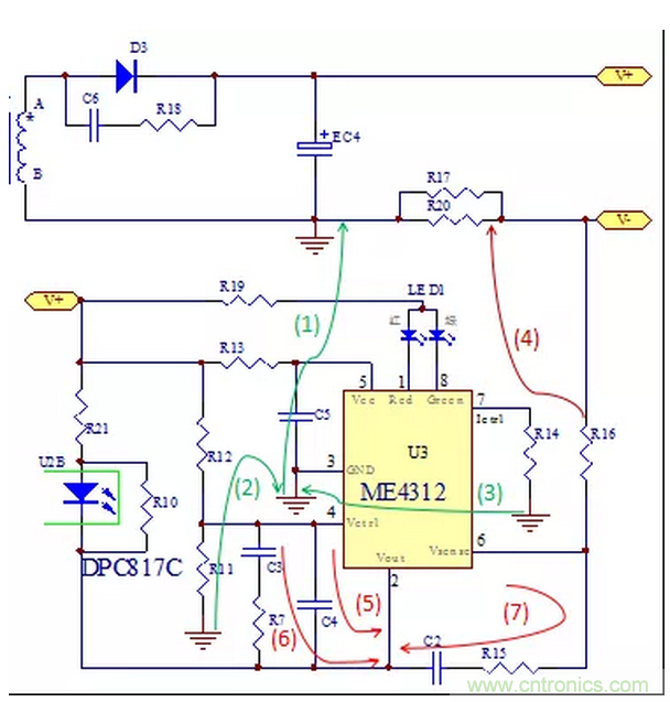 如(1)(2)(3)綠線所示,R11的地和R14的地連接到芯片的地,再連接到EC4電解電容的地。注意不可連到變壓器的地,因為變壓器次級A->D3->EC4->次級B形成功率環,如果ME4312芯片的地接到次級B線到EC4電容之間,受到較強的di/dt幹擾會導致係統的不穩定等因素。