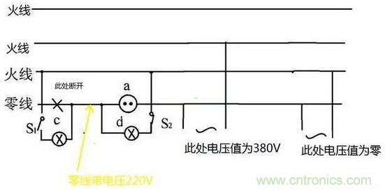 給出草圖當零線斷開時,如過上端負載有未斷開的情況,如圖S2閉(bi)合(he)的(de)情(qing)況(kuang)火(huo)線(xian)與(yu)零(ling)線(xian)通(tong)過(guo)負(fu)載(zai)的(de)線(xian)圈(quan)串(chuan)聯(lian)到(dao)了(le)一(yi)起(qi),那(na)麼(me)零(ling)線(xian)就(jiu)是(shi)和(he)火(huo)線(xian)帶(dai)一(yi)樣(yang)的(de)電(dian)壓(ya)值(zhi)。你(ni)家(jia)裏(li)的(de)零(ling)線(xian)如(ru)果(guo)是(shi)從(cong)斷(duan)點(dian)後(hou)端(duan)接(jie)出(chu)來(lai)的(de),電(dian)壓(ya)值(zhi)如(ru)上(shang)圖(tu)兩(liang)種(zhong)情(qing)況(kuang)380V或者零伏。