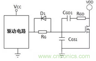 關斷過程中,高的dVDS/dt通過CGD1耦合到柵極形成瞬態的尖峰電壓,如果此尖峰電壓大於功率MOSFET的閾值電壓,會誤導通功率MOSFET,串聯電阻RGD可以減小功率MOSFET的誤導通。