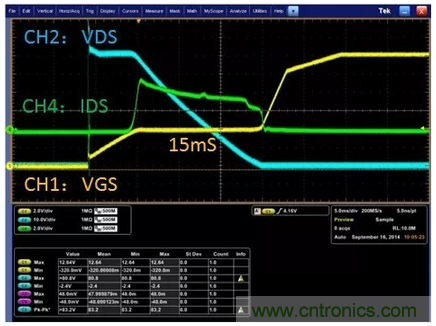 根據係統浪湧電流和di/dt的要求,使用上麵公式就可以求出外加的電容CGS1,由此選取相應的標準電容值。不同的CGS1值可以改變過衝的峰值浪湧電流的大小。