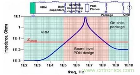 在(zai)調(tiao)試(shi)該(gai)故(gu)障(zhang)前(qian)先(xian)回(hui)顧(gu)下(xia)電(dian)源(yuan)噪(zao)聲(sheng)抑(yi)製(zhi)的(de)原(yuan)理(li)。如(ru)下(xia)圖(tu)所(suo)示(shi),電(dian)源(yuan)分(fen)配(pei)網(wang)絡(luo)中(zhong)不(bu)同(tong)的(de)頻(pin)段(duan)由(you)不(bu)同(tong)的(de)元(yuan)件(jian)來(lai)抑(yi)製(zhi)噪(zao)聲(sheng),去(qu)耦(ou)元(yuan)件(jian)包(bao)含(han)電(dian)源(yuan)調(tiao)整(zheng)模(mo)塊(kuai)(VRM)、去耦 電容、PCB電源地平麵對、器件封裝和芯片。VRM包含電源芯片及外圍的輸出電容,大約作用於DC到低頻段(100K左右),其等效模型是一個電阻和一個 電感組成的二元件模型。去耦電容最好使用多個數量級容值的電容配合使用,充分覆蓋中頻段(數10K到100M左右)。由於布線電感和封裝電感的存在,即時 大量堆砌去耦電容也難以在更高頻起到作用。PCB電源地平麵對形成了一個平板電容,也具有去耦作用,大約作用在數十兆。芯片封裝和芯片負責高頻段 (100M以上),目前的高端器件一般會在封裝上增加去耦電容,此時PCB上的去耦範圍可以降低到數十兆甚至幾兆。因此,在電流負載不變的情況下,我們隻 yaopanduanchudianyazaoshengchuxianzainagepinduan,namezhenduizhegepinduansuoduiyingdequouyuanjianjinxingyouhuajike。zailianggequouyuanjiandexianglinpinduanshilianggequouyuanjianhuipeihezuoyong,suoyizaifenxiquouyuan 件臨界點時相鄰頻段的去耦元件也要同時納入考慮。