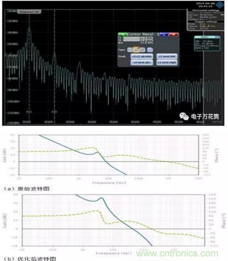 一般來說,11.3KHz應該是VRM的管轄範圍,此處出現較大噪聲說明VRM電路設計不能滿足 要求。這裏對VRM的性能進行分析,VRM分析的方法眾多,此處主要采用仿真其反饋環路波特圖的手段。波特圖主要觀察幾個關鍵信息:1、穿越頻率,增益曲 線穿越0dB線的頻率點;2、相位裕度,相位曲線在穿越頻率處所對應的相位值;3、增益裕度,相位在-360°時所對應的增益值。這裏我們主要關注穿越頻 率和相位裕度這兩個指標。從VRM的環路波特圖(如下圖a)可以看到,VRM的穿越頻率在8KHz左右,相位裕度37度。這裏存在兩個問題:首先VRM的 相位裕度一般需要大於45度才能保證環路的穩定工作,這裏相位裕度稍小一些,需要增加相位裕度;其次穿越頻率太低,穿越頻率附近VRM的調整作用逐漸降低,而此頻點bulk電容還起不到作用,所以在8KHz附近會存在較高的阻抗,這個頻點的噪聲抑製作用較差。下圖(b)是優化VRM環路之後的波特圖,調整相位裕度到50度,穿越頻率推到46KHz左右。