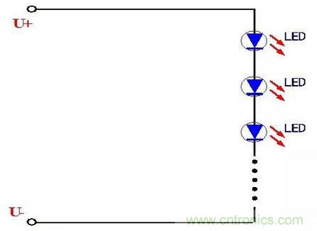 這種串聯連接的方式電路比較簡單,首尾連接在一起,LED工作時流過的電流一致很好,由於LED屬於電流型器件,因此基本可以保證每個LED的發光強度一致。采取這種LED連接方式的電路簡單、連接方便。但是也有一個致命的缺點,那就是當其中一個LED發生開路故障時,將造成整個LED燈串的熄滅,影響了使用的可靠性,這就需要保證每個LED的質量過硬,這樣可靠性也就相應的提高。