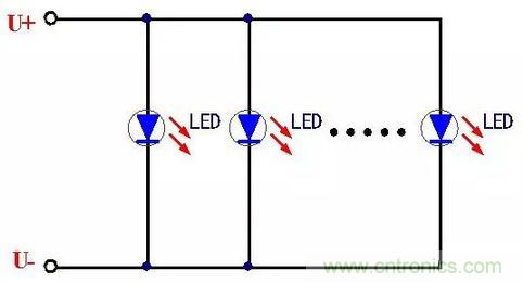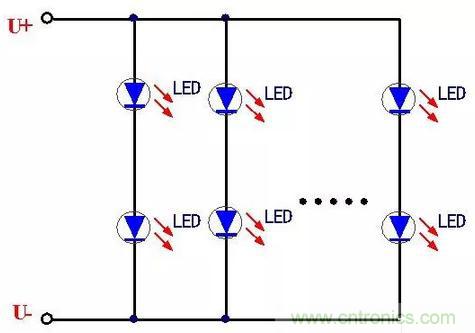 並聯方式特點是LED首尾並聯連接,工作時每個LED上承受的電壓相等。但是電流不一定相等,即使是同一種型號、同一種規格批次的LED也是如此,這是由於生產製造工藝等原因導致。因此,每個LED電流分配的不均可能使電流過大的LED壽命相對於其他的LED有損下降,久而久之容易燒壞。這種並聯連接方式電路較為簡單,但是可靠性也不高,特別LED數量較多情況下發生故障可能性更高。