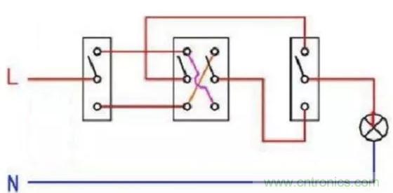 把兩個單刀雙擲開關的兩個觸點分別相連,即開關1的觸點1與開關2的觸點1相連,開關1的觸點2與開關2的觸點2相連,然後兩個開關的刀做為整個開關的兩端接入電燈的兩端。這樣當開關1和2的刀同時接打向各自觸點1或同時打向觸點2時,電路接通,則燈亮。若兩開關的刀一個打向觸點1而另一個打向觸點2時shi,電dian路lu不bu通tong,則ze燈deng滅mie。因yin此ci兩liang個ge開kai關guan都dou可ke以yi控kong製zhi燈deng。兩liang個ge開kai關guan可ke以yi放fang在zai樓lou梯ti的de上shang下xia兩liang端duan,或huo走zou廊lang的de兩liang端duan,這zhe樣yang可ke以yi在zai進jin入ru走zou廊lang前qian開kai燈deng,通tong過guo走zou廊lang後hou在zai另ling一yi端duan關guan燈deng,既ji能neng照zhao明ming,又you能neng避bi免mian人ren走zou燈deng不bu滅mie而er浪lang費fei電dian。