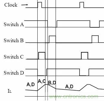 當輸入電壓比輸出電壓低△V,即輸入電壓略高於輸出電壓時,係統工作於降壓式BuckBoos模式。開關周期起始時,開關管B/D先同時導通,然後A/C同時導通,最後是A/D同時導通,即開關管導通的順序為:B/D–A/C–A/D。