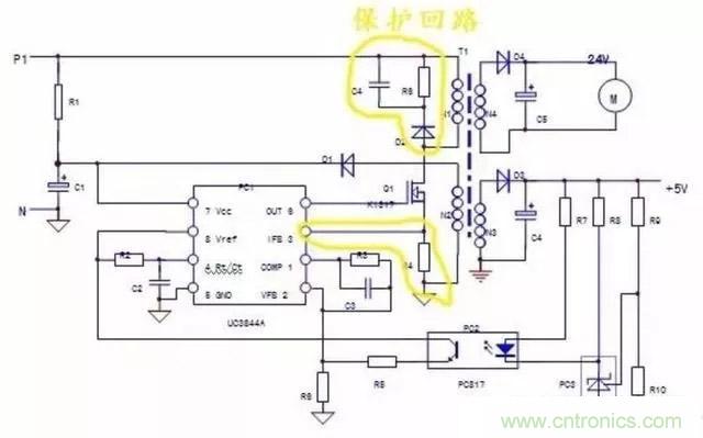 3)保護回路:PC1芯片本身和3腳外圍元件R4構成過電流保護回路;N1繞組上並聯的D2,R6,C4元件構成了開關管的反壓吸收保護電路;實質上穩壓回路的電壓反饋信號——wenyaxinhao,yekekanzuoyiludianyabaohuxinhao,danbaohudianludeneirongbingbujinshijuxianyubaohudianlubenshen,baohudianludeqikongwangwangshiyouyufuzaidianluyichangsuoyinqide。