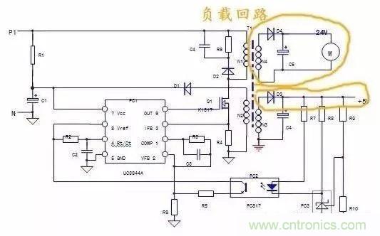 4)負載回路:N3,N4二次繞組及後續電路,均為負載回路,負載回路的異常,會牽涉到保護回路和穩壓回路,使兩個回路做出相應的保護和調整動作。