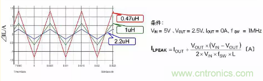 在這裏,為加深對電感工作的理解,進一步說明電感值變化時電感電流如何變化的情形。下圖表示在相同工作條件下將電感值設為0.4μH、1μH、2.2μH時ILPEAK。