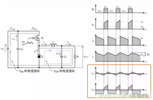 圖中上方ICO為輸出電容器、下方的ICIN為輸入電容器的電流波形。輸入電容器可從VIN充電,當晶體管Q1為ON時會放出開關電流IDD。比較大的電流會急劇反複流動。輸出電容器以輸出電壓為中心反複與輸出紋波電壓連動進行充放電工作。
