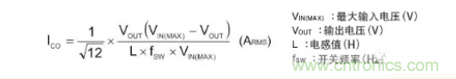 輸出電容器的紋波電流如上圖的ICO所示是三角波,而其實效值則用下麵公式表示。