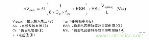 以下是表示輸出紋波電壓的公式。電容器的紋波電壓和ESR的紋波由於相位偏離,故無法進行單純的加算,不過卻是紋波電壓的最差值概算常用的公式。