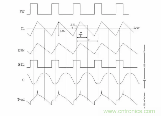 通過開關所產生的電感電流紋波ΔIL將產生與ESR成單純正比的紋波電壓,有些ESL則會產生方形波電壓,與電容值部分合成,最下方波形成為最終的輸出紋波電壓波形。