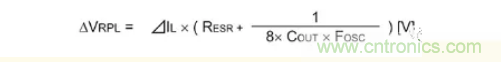 輸出紋波電壓是通過上圖的電感電流IL紋波ΔIL和輸出電容器的容值、ESR、ESL所產生的電壓合成波形,用下麵公式表示。
