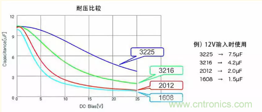 關於DC偏置,當然須選擇影響少的,不過即使電容值、耐壓相同,變動特性也會因封裝尺寸而異。下方圖表為其一例,顯示尺寸大者變動少。總之,請務必從電容器廠商取得充分的信息。