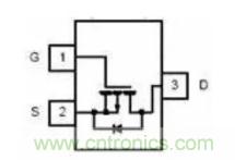仔細看看你會發現,這兩個圖似乎有差別,對了,這實際上是兩種不同的增強型場效應管,第一個那個叫N溝道增強型場效應管,第二個那個叫P溝gou道dao增zeng強qiang型xing場chang效xiao應ying管guan,它ta們men的de的de作zuo用yong是shi剛gang好hao相xiang反fan的de。前qian麵mian說shuo過guo,場chang效xiao應ying管guan是shi用yong電dian控kong製zhi的de開kai關guan,那na麼me我wo們men就jiu先xian講jiang一yi下xia怎zen麼me使shi用yong它ta來lai當dang開kai關guan的de,從cong圖tu中zhong我wo們men可ke以yi看kan到dao它ta也ye像xiang三san極ji管guan一yi樣yang有you三san個ge腳jiao,這zhe三san個ge腳jiao分fen別bie叫jiao做zuo柵zha極ji(G)、源極(S)和漏極(D),mpn中的貼片元件示意圖是這個樣子: