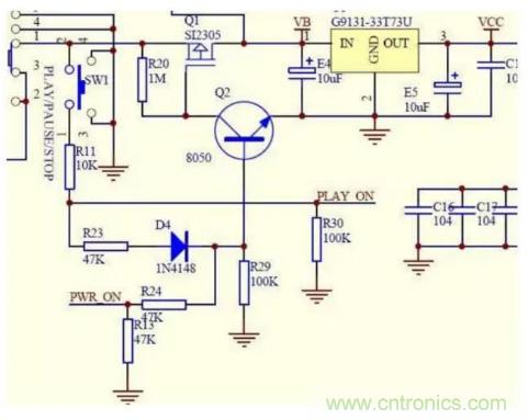 圖中電池的正電通過開關S1接到場效應管Q1的2腳源極,由於Q1是一個P溝道管,它的1腳柵極通過R20電阻提供一個正電位電壓,所以不能通電,電壓不能繼續通過,3v穩壓IC輸入腳得不到電壓所以就不能工作不開機!這時,如果我們按下SW1開機按鍵時,正電通過按鍵、R11、R23、D4加到三極管Q2的基極,三極管Q2的基極得到一個正電位,三極管導通(前麵講到三極管的時候已經講過),由於三極管的發射極直接接地,三極管Q2導通就相當於Q1的柵極直接接地,加在它上麵的通過R20電阻的電壓就直接入了地,Q1的柵極就從高電位變為低電位,Q1導通電就從Q1同過加到3v穩壓IC的輸入腳,3v穩壓IC就是那個U1輸出3v的工作電壓vcc供給主控,主控通過複位清0,讀取固件程序檢測等一係列動作,輸處一個控製電壓到PWR_ON再通過R24、R13分壓送到Q2的基極,保持Q2一直處於導通狀態,即使你鬆開開機鍵斷開Q1的基極電壓,這時候有主控送來的控製電壓保持著,Q2也就一直能夠處於導通狀態,Q1就能源源不斷的給3v穩壓IC提供工作電壓!SW1還同時通過R11、R30兩個電阻的分壓,給主控PLAY ON腳送去時間長短、次數不同的控製信號,主控通過固件鑒別是播放、暫停、開機、關機而輸出不同的結果給相應的控製點,以達到不同的工作狀態!