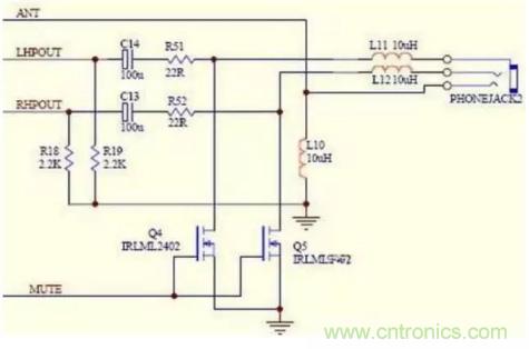 上圖是一個有主控控製耳機有沒有聲音輸出的電路圖,聲音的左右聲道分別通過隔直流電容C13、C14和電阻R51、R52送到耳機孔,但是在電阻R51、R52和耳機孔之間卻接入了一個N溝道的mos場效應管,這個場效應管的柵極連接在一起受著MUTE的控製,當MUTE的地方處於高電位時候,Q4、Q5導通,就會把聲音通過Q4、Q5入地,耳機裏就不會有聲音了,當MUTE的地方處於低電位時候,Q4、Q5關斷,聲音就隻有通過耳機而發出聲音了!