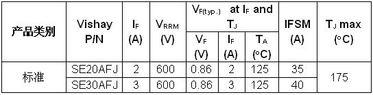 導讀:Vishay近日推出新款通過AEC-Q101認證並具有ESD保護的600V標準整流器SE20AFJ和SE30AFJ。該款高電流密度器件通過AEC-Q101認證,具有高達3A的正向電流。