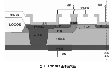 RF功率LDMOSFET是具有橫向溝道結構的功率MOSFET,它以LDMOSFET為基本結構,利用雙擴散技術在同一窗口相繼進行硼、磷兩次擴散,通過兩種雜質橫向擴散的結深之差精確控製溝道長度。其基本結構如圖1所示,由幾個關鍵結構組成: