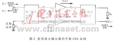 通常,在LNA的設計中主要考慮低噪聲係數(NF)。足夠的增益(G)和絕對的穩定性?對於本文TMA放大器中LNA設計的實際技術規範要求如表1所示。同時要求所使用的LNA結構滿足良好的輸入輸出匹配,保證LNA的穩定性,兼顧到功分/合路網絡的低損耗、幾何尺寸小,工作帶寬內良好的相位和幅度匹配,足夠的工作帶寬(涵蓋在1.95GHz左右),符合CDMA標準上行頻率?據此選擇了以平衡結構為特征的LNA結構(如圖2)。這種平衡結構的重要特性是:它較單階放大器的截點高出一倍,並以標準50Ω實現輸入輸出匹配,在某一路硬件失效時電路的冗餘設計可保證係統的正常運行。但通常增益減少6dB。
