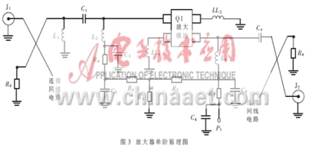 因規範要求NF最大值隻有1dB,為實現放大器的最佳噪聲匹配,網絡采用高通阻抗匹配。放大電路原理圖如圖3所示,它的輸入匹配網絡由一個串聯的電容C1和兩個並聯的電感L1和L2組成。因電路損耗將直接與噪聲係數相關,這樣L1和L2的高Q值則變得非常重要。短路電感L1能夠在低頻端提供增益衰減,同時又與C1一起作為輸入匹配阻抗的一部分,C1同時要作為直流隔斷電容。L2還要為pHEMT做偏置電感,在柵極加入電壓偏置,它要求有一個好的旁路電容C2。這個網絡是對於低噪聲係數。輸入回波損耗和增益都加以兼顧考慮的方案,電容C2。C4保證帶內的穩定性,低頻端電阻R3。R4作為阻性終端以保證低頻時係統的穩定性。輸出高通匹配網絡由C4和L3組成,分路電感L3的作用與L2相同,作為pHEMT管偏置載入電感,在漏極偏置。