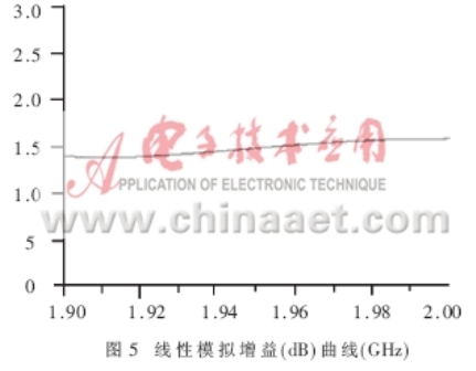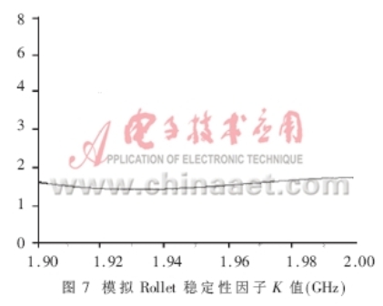 除了能夠得出增益、NF、P1dB和輸入輸出回波等重要參數外,軟件模擬還能夠得出關於電路設計穩定性的信息。它是電路能否正常工作的重要前提。模擬軟件計算Rollet穩定性因子K和作穩定性圓是兩種很容易做到的方法,它們可以明確地表示出穩定性的數據。圖7示出的Rollett穩定因子K的模擬值(K>1)表明:在1.9~2.0GHz工作帶寬範圍,電路能夠實現無條件穩定。