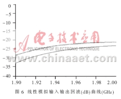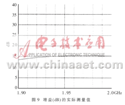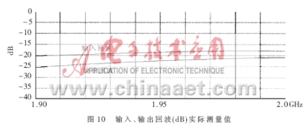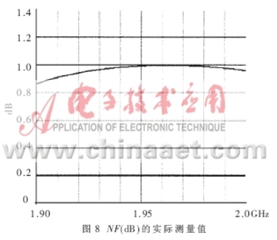 得到了完整的電路PCB板後,就要實際測量電路的各個參數,驗證設計的仿真結果是否與之相符,是否最終符合表1的設計技術規範。本文所采用的測試儀器是HP8753ES網絡分析儀和HP8970B噪聲儀。圖8、圖9表達出放大器實測的NF和增益曲線,在帶寬為0.1GHz的頻率範圍內NF的值在0.8dB和1.0dB之間,增益在1.97GHz達到最大值15.5dB,在1.99GHz達到了15.3dB。由於NF是在實際PCB板外腔體內測得的,包含了同軸連接器的損耗和二級噪聲損耗,其測量指標表明實際的電路NF特性要稍差於模擬特性。圖10是輸入、輸出的回波曲線。當頻點在1.96GHz時,輸入回波為18dB,輸出回波達到22.5dB,放大器的OIP3在直流偏置Vds=3V,Id=60mA時測得值為37dBm,P1dB為21.4dBm。電路在較低的偏置狀態下Vds=3V,Id=40mA放大器的NF和增益都沒有降低,隻有OIP3測出下降為36.5dBm。