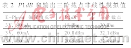對於非線性模擬,常以諧波平衡模擬(HB)來實現。非線性模擬方法HB計算速度快,能夠處理分布元件和分立元件的電路,並很容易與更高階諧波及互調元件相容。ATF-54143管的P1dB和OIP3模擬非線性模型是基於W.R.Curtice模型,這個模型可以非常近似地模擬直流和小信號工作狀態(包括噪聲),對於截點的模擬則做出模擬預測結果比實際值要偏低。P1dB和OIP3的值如表2 所示:當平衡LNA放大器的OIP3模擬結果為32.1dBm時,P1dB則為20.8dBm,P1dB的模擬結果與實際的測量結果很接近,而OIP3的模擬結果則偏低,實際的測量結果達到37dBm。