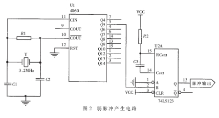 利用數字電路產生周期脈衝信號的方法有很多,本文采用的是利用方波發生器4060產生周期為20μs的方波信號,然後觸發單穩態觸發器74LS123產生脈寬為50ns~150ns可調的脈衝周期信號。電路原理圖如圖2所示。