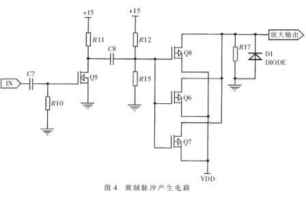 弱脈衝放大電路的輸出脈衝通過控製MOS管的通斷控製電容的充放電,從而形成符合要求的調製脈衝,驅動振蕩器工作。調製脈衝產生電路如圖4所示。