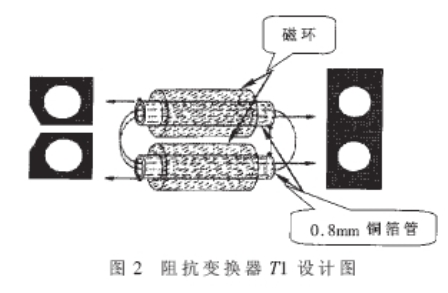 圖2中深色區域代表覆銅區域。銅箔管首先穿過磁環後再穿過兩端的銅膜板並焊接在一起,完成次級線圈。T2的設計基本與T1相似,隻是使用同軸線SFF-1.5-1的芯線纏繞的初級線圈圈數不同而已。