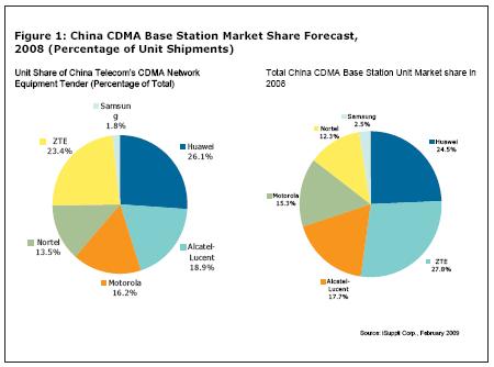 圖1所示為iSuppli公司對2008年中國電信的CDMA布署BTS市場份額,以及全國CDMA市場的預測。